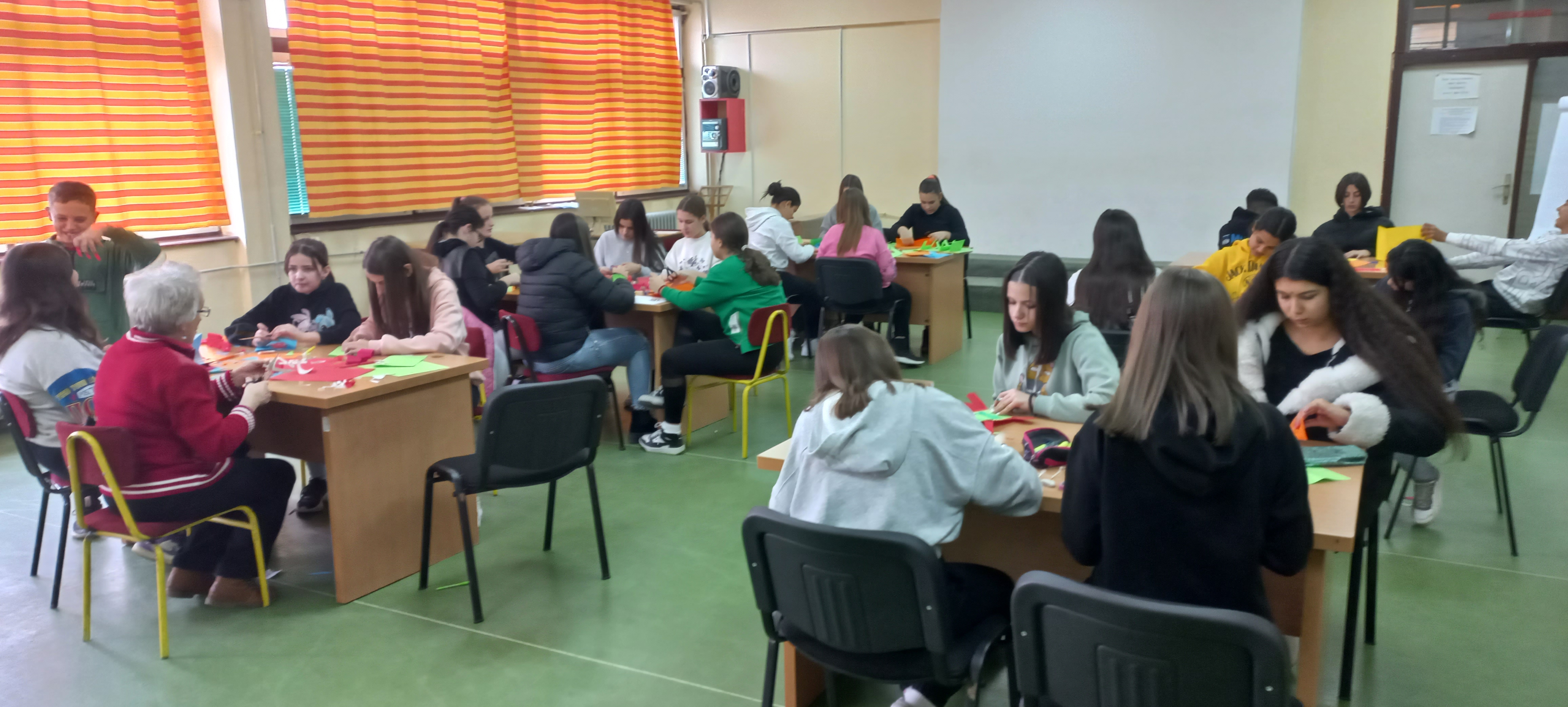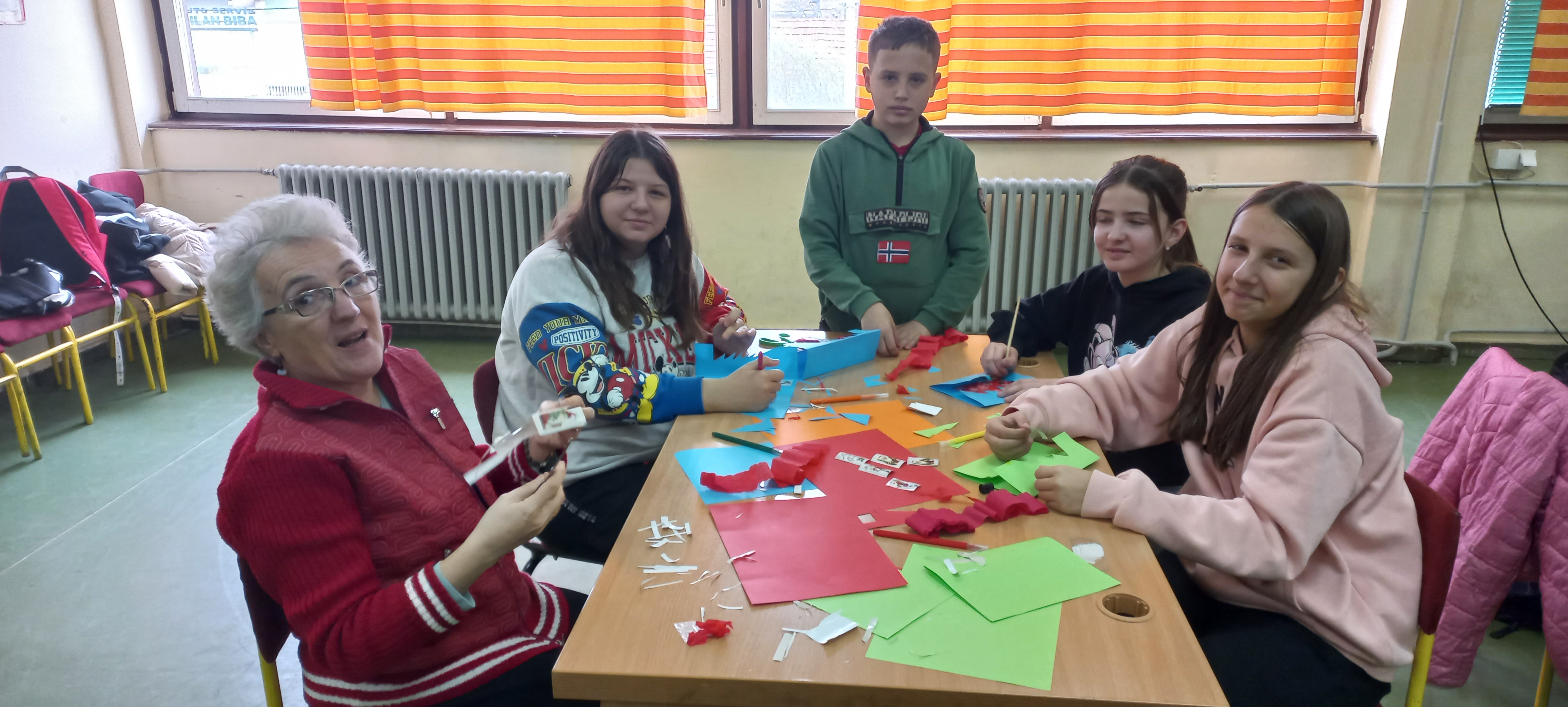 У оквиру пројекта „ Заједно ка средњој школи“, одржана је креативна радионица у медијатеци школе. Наши вредни ученици у пријатној атмосфери израђивали су новогодишње честитке. Водитељ радионице била је наставница Слађана Димитријевић, која је пре два месеца отишла у заслужену пензију. Иначе она је остала наш верни сарадник и пријатељ. Ученици су били одушевљени кад су је видели и радосно јој притрчали у загрљај. Надамо се да ћемо и даље сарађивати у реализацији разних активности.